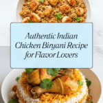 This Indian Chicken Biryani recipe offers a fragrant and flavorful one-pot meal combining tender chicken cooked with spices and yogurt, layered with partially cooked basmati rice and slow-cooked to perfection. The use of whole spices like cinnamon, cardamom, and cloves, along with fresh herbs, gives this traditional dish its authentic aroma and taste.