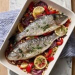 This Italian baked sea bass is a vibrant and flavorful dish that combines tender fish with roasted peppers, olives, and pine nuts. It’s simple to prepare and perfect for a light, Mediterranean-inspired meal.