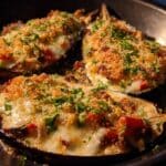 A delicious Italian-style stuffed aubergine recipe featuring tender baked aubergine shells filled with a savory mixture of sautéed onion, garlic, tomatoes, olives, fresh basil, and melted vegetarian mozzarella, topped with crispy breadcrumbs for a perfect finish.