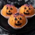 - Decorate Top: Using a pastry brush, apply cooled chocolate on top of the pumpkin and immediately sprinkle colorful confetti sprinkles for a festive look.