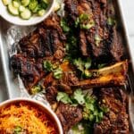 - Garnish and Serve: Transfer the cooked galbi to a serving platter. Garnish generously with toasted sesame seeds and sliced green onions. Optionally add coriander or cilantro leaves. Serve hot with sides like kimchi fried rice and ginger smashed cucumbers. No additional sauces are needed as the galbi is bursting with savory and sweet flavors.