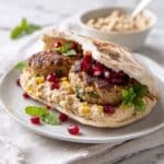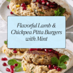 A delicious and healthy Lamb & Chickpea Pitta Burger recipe featuring lean lamb mince mixed with chickpeas, aromatic spices, roasted red peppers, and fresh mint. These flavorful burgers are pan-fried until golden and served in toasted pitta breads with a tangy pepper houmous and fresh pomegranate seeds for a perfect balance of savory and sweet.