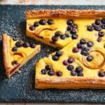 A delightful and tangy Lemon & Blueberry Cheesecake Tart featuring a crisp puff pastry base topped with a creamy lemon-infused cheesecake filling swirled with lemon curd and studded with fresh blueberries. Perfect for a refreshing dessert or afternoon treat.