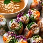 These Lemongrass Chicken Rice Paper Rolls are a vibrant and fresh Vietnamese-inspired appetizer featuring marinated and caramelized chicken, crunchy vegetables, and delicate vermicelli noodles wrapped in tender rice paper. Served with a smooth, flavorful peanut dipping sauce, they’re perfect for a light meal or party snack.