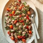 A fresh and nutritious Lentil & Tuna Salad combining protein-rich puy lentils and tender tuna steaks with vibrant cherry tomatoes, roasted peppers, and a zesty sherry vinegar dressing. This easy-to-prepare salad is perfect for a light lunch or healthy dinner.