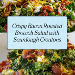 Keywords: roasted broccoli salad, bacon salad, sourdough croutons, feta cheese salad, lemon broccoli salad, easy roasted vegetable salad