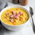 Keywords: mac and cheese soup, cheesy soup, ham and cheese, comfort food, creamy soup, easy soup recipe