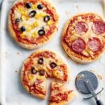 Keywords: mini pizzas, homemade pizza dough, topping-your-own pizza, Italian, easy pizza recipe, baking pizza, family meal