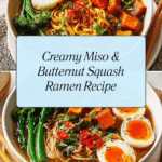 This Miso & Butternut Squash Ramen is a comforting and flavorful vegetarian dish featuring roasted butternut squash and purple sprouting broccoli combined with a rich miso and peanut butter broth. Topped with soft-boiled eggs, fresh coriander, and a touch of chili for a mild kick, this hearty ramen is perfect for a nourishing dinner packed with umami and plant-based goodness.