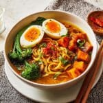 This Miso & Butternut Squash Ramen is a comforting and flavorful vegetarian dish featuring roasted butternut squash and purple sprouting broccoli combined with a rich miso and peanut butter broth. Topped with soft-boiled eggs, fresh coriander, and a touch of chili for a mild kick, this hearty ramen is perfect for a nourishing dinner packed with umami and plant-based goodness.