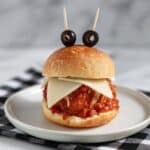 - Assemble Sliders: Place one slider bun on a plate, top with a warmed meatball and some sauce. Add the mozzarella cheese triangles on top to represent the monster’s teeth.