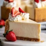 - Serve: Remove the springform sides. Use the parchment paper overhang to slide the cheesecake base onto a serving platter, then carefully slide off the paper. Decorate the top with halved strawberries and dollops of whipped cream as desired. Slice and serve chilled.