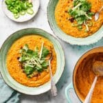 Red lentils work best for this recipe as they cook quickly and become soft and creamy. Other lentils like green or brown lentils require longer cooking times and won’t break down as much.