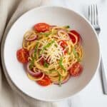 - Finish and serve: Serve the pasta topped with grated Parmesan cheese and garnish with any remaining fresh basil leaves. Pair with a salad or garlic bread if desired for a complete meal. Enjoy!