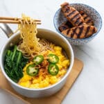 - Garnish and Serve: Sprinkle chopped scallions, fried shallots, and pickled jalapeño peppers over the top. Serve the grilled Spam on the side to keep it crispy. Enjoy immediately while hot.