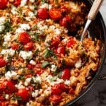 - Finish and Serve: Remove the skillet from the oven and drizzle with fresh lemon juice. Sprinkle crumbled Greek feta cheese over the dish and garnish with fresh oregano leaves if desired. Serve hot and enjoy your Mediterranean-style one pot chicken risoni.