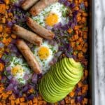 This one sheet pan sweet potato breakfast is a wholesome, vibrant morning meal featuring roasted sweet potatoes, red cabbage, chicken apple sausages, and baked eggs, all finished with creamy avocado slices and fresh herbs. It’s an easy, all-in-one dish perfect for a nutritious and flavorful start to your day.