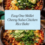 This One Skillet Cheesy Salsa Chicken Rice Bake is a flavorful and comforting dish combining tender chicken, spiced rice, and melted cheeses, all cooked together in one pan for easy cleanup. Packed with vibrant ingredients like bell peppers, black beans, and chipotle chili powder, it’s an effortless weeknight dinner that brings Mexican-inspired flavors to your table.