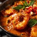 Authentic Panang Curry from scratch featuring succulent prawns and tender chicken thighs simmered in a rich, flavorful coconut cream sauce with aromatic herbs and spices, served over fragrant jasmine rice.