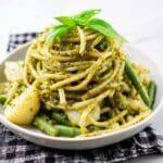 - Toss Pasta with Pesto: In a large serving bowl, mix the reserved pasta water with two heaping spoonfuls of pesto. Add the drained pasta, potatoes, and green beans and toss thoroughly to coat everything evenly.