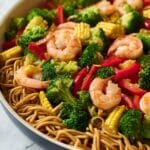- Toss Ingredients Together: Add the cooked noodles, broccoli, and baby corn along with the prawns into the pan with the red pepper. Toss everything together gently to combine the flavors evenly.