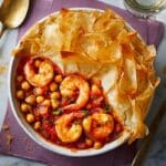 Keywords: prawn pie, chickpea pie, filo pastry, harissa recipe, roasted pepper pie, Mediterranean seafood dish