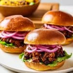 - Assemble the Burgers: Spoon the pulled aubergine and black bean mixture into the toasted burger buns. Top with red onion or pink pickled onion, shredded lettuce, or any other desired toppings. Serve with optional sides such as coleslaw and corn on the cob for a complete meal.