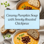 This Pumpkin Soup with Smoky Roasted Chickpeas is a comforting and flavorful autumn dish that combines the natural sweetness of roasted sugar pumpkin and red bell pepper with the delightful smoky crunch of seasoned chickpeas. Creamy, subtly spiced, and garnished with fresh thyme, this soup makes a perfect warm meal for chilly days.
