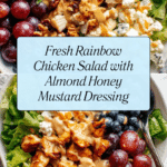This vibrant Rainbow Chicken Salad combines tender sautéed chicken breast with fresh grapes, blueberries, crunchy almonds, and tangy feta cheese, all tossed with a creamy almond honey mustard dressing. It’s a colorful, flavorful, and nutritious salad perfect for a light lunch or dinner.