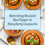 A refreshing and vibrant roasted red pepper and strawberry gazpacho that blends the sweetness of strawberries with the smoky depth of charred red peppers. This chilled Spanish-style soup is enhanced with cucumber, garlic, thyme, and balsamic vinegar, and served with crispy garlic thyme croutons for added texture and flavor.