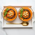 A refreshing and vibrant roasted red pepper and strawberry gazpacho that blends the sweetness of strawberries with the smoky depth of charred red peppers. This chilled Spanish-style soup is enhanced with cucumber, garlic, thyme, and balsamic vinegar, and served with crispy garlic thyme croutons for added texture and flavor.