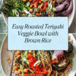 Keywords: Roasted teriyaki vegetables, vegetarian bowl, healthy veg bowl, ginger teriyaki sauce, brown rice bowl, easy roasted veggies