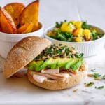 - Step 5: Top the salmon with avocado slices, spoonfuls of kale salsa, and sprinkle with toasted seeds. Add the bun lids and serve the burgers with the remaining kale salsa and sweet potato wedges on the side.