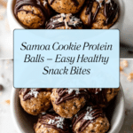 Keywords: Samoa cookie protein balls, energy bites, healthy snacks, no-bake protein balls, almond butter snacks, toasted coconut protein balls, post-workout snacks