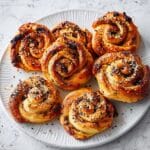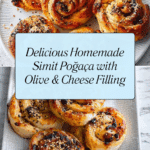 Simit poğaça is a delicious Turkish pastry that combines a soft, buttery dough with a savory filling of olives, feta, cheddar, and parsley. Twisted into elegant shapes and topped with sesame and nigella seeds, these pastries are perfect for breakfast, snacks, or sharing with friends.