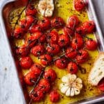 Keywords: slow roasted tomatoes, garlic, olive oil, baked tomatoes, Mediterranean side dish, vegetarian recipe, easy tomato sauce