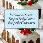 Snow-topped holly cakes are a festive, richly spiced fruitcake featuring a luscious blend of dried fruits, nuts, and warming spices, topped with marzipan and a sweet fondant icing decorated with holly sprigs and glace cherries. Perfect for holiday celebrations, this traditional cake is soaked with rum, brandy, or orange juice for deep flavor and has a moist, dense texture that keeps well.