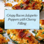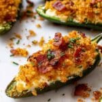 These jalapeño poppers are a deliciously cheesy and crispy appetizer featuring fresh jalapeños stuffed with a creamy mixture of cream cheese, sharp cheddar, savory bacon, and green onions. Crispy bacon bits and toasted panko breadcrumbs on top add a perfect crunch, baked to golden perfection in the oven.