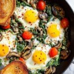 A nutritious and flavorful skillet dish combining sautéed mushrooms, fresh spinach, and creamy spinach artichoke dip, topped with perfectly cooked eggs and garnished with cherry tomatoes. Served alongside toasted French bread, this recipe makes a satisfying breakfast or light meal.