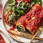 A delicious and wholesome Spinach Crespolini recipe featuring wholemeal spelt flour pancakes filled with a creamy spinach and ricotta mixture, topped with a smooth tomato and basil sauce, baked to golden perfection and served alongside a fresh rocket and cherry tomato salad.
