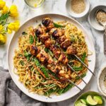 These sticky ginger and honey chicken skewers are bursting with flavor and perfectly paired with a vibrant noodle salad. The combination of sweet, tangy, and savory notes makes this dish a delightful meal for any occasion.