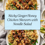 Deliciously sticky ginger and honey chicken skewers served with a fresh, vibrant noodle salad. This recipe combines tender chicken thighs marinated in a flavorful blend of garlic, ginger, sesame oil, honey, soy sauce, and lime juice, grilled to perfection and paired with crunchy mangetout, carrot, coriander, and sesame seeds tossed with egg noodles. Perfect for a satisfying and colorful meal with a balance of sweet, savory, and tangy flavors.