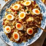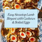 This stovetop lamb biryani is a fragrant, richly spiced Indian-inspired dish featuring tender lamb rump marinated in aromatic spices and yogurt, layered with partially boiled basmati rice, toasted cashews, and curry leaves. Cooked entirely on the stovetop, this recipe combines the depth of slow-simmered lamb with the delicate flavors of cardamom, cinnamon, and Kashmiri chili for a comforting, flavorful one-pot meal served with perfectly boiled eggs.