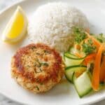 - Plate and Serve: Divide the carrot and cucumber salad among four plates. Place the salmon burgers on each plate alongside lemon wedges and serve with cooked rice if desired for a complete meal.