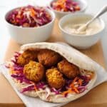Store leftover falafels in an airtight container in the refrigerator for up to 3 days. Reheat in the oven or toaster oven to retain their crispiness rather than microwaving. Keep the coleslaw separate and assemble just before serving to maintain freshness.