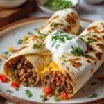 These Taco Roll Ups with Tortillas are a delicious and fun way to enjoy classic taco flavors in a handheld form. Ground beef seasoned with taco spices is rolled with cheese, sour cream, tomatoes, and lettuce inside soft flour tortillas, then pan-fried to a crispy golden brown. Perfect as an appetizer, snack, or light meal, they pair wonderfully with salsa, guacamole, or extra sour cream.