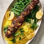 This Tandoori Chicken King Kebab served with a vibrant turmeric and green bean biryani combines bold spices with tender chicken for a flavorful meal. The juicy kebab pairs perfectly with the aromatic, colorful rice, making it a show-stopping dish for any occasion.