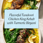 This recipe features succulent Tandoori Chicken King Kebabs paired with a vibrant Turmeric & Green Bean Biryani. The chicken thighs are marinated in a fragrant tandoori paste and yogurt mixture, then grilled to smoky perfection. Meanwhile, the biryani is cooked with turmeric, cardamom, and cinnamon, enhanced by fresh green beans for a wholesome and flavorful one-dish meal perfect for gatherings or a special weeknight dinner.