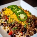This Tex-Mex Beef and Rice casserole is a hearty and flavorful one-dish meal combining seasoned ground beef, black beans, rice, and melted cheddar cheese with a blend of Tex-Mex spices. Perfect for an easy weeknight dinner, it’s baked until the rice is tender and the cheese is golden and bubbly, then topped with fresh cilantro, jalapeños, and sour cream for an added burst of flavor.