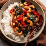 A flavorful and quick Thai Cashew Chicken Stir Fry featuring tender chicken thighs, crunchy roasted cashews, and a savory homemade sauce, all stir-fried to perfection and served with fragrant jasmine rice. This dish balances sweet, salty, and spicy elements for an authentic Thai home-cooked meal.